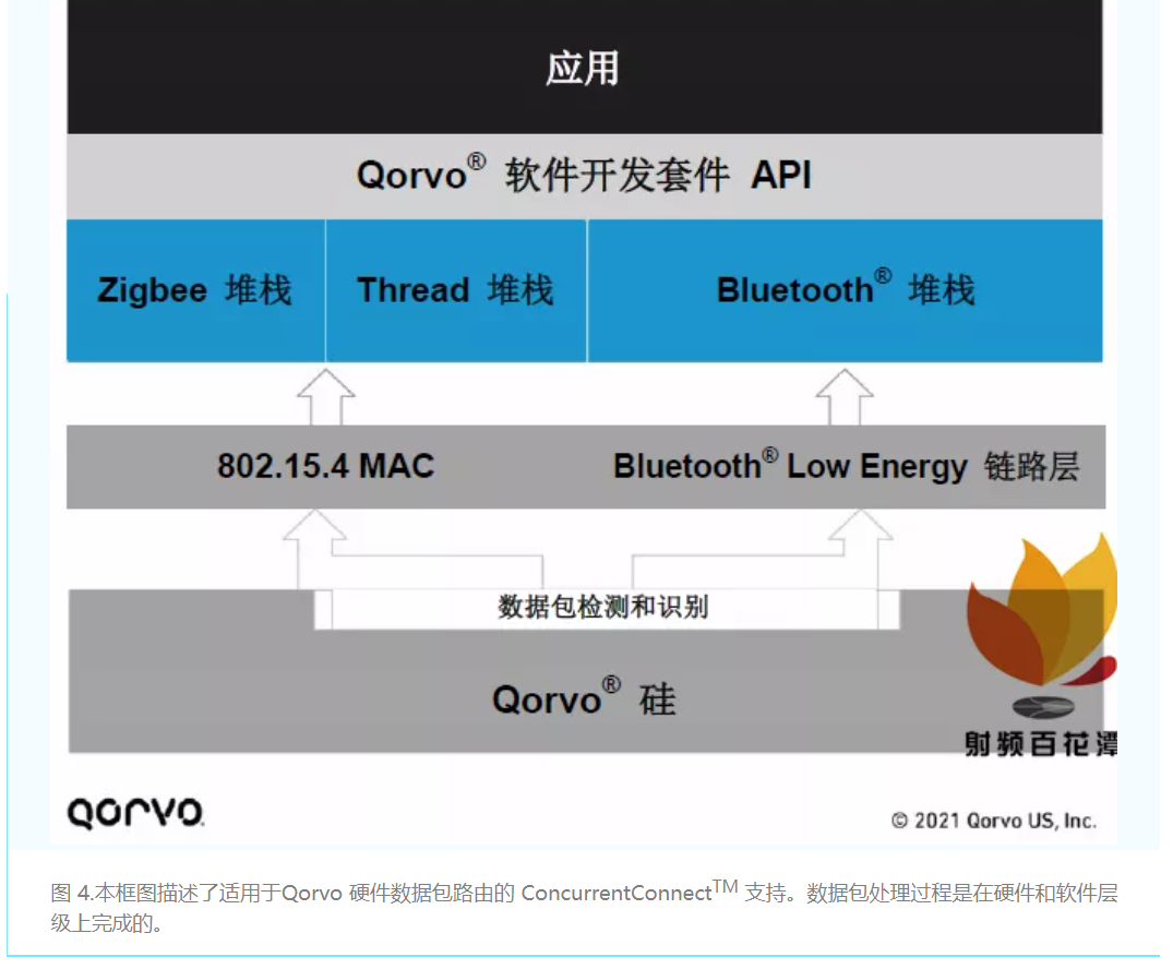 ConcurrentConnectTM 技術(shù)基于 Qorvo 平臺獨(dú)特的硬件功能,即以最有效的方式檢測和識別數(shù)據(jù)包。只要被檢測到,數(shù)據(jù)包就會在硬件層實(shí)時(shí)完成標(biāo)識流程,然后將數(shù)據(jù)包發(fā)送至適當(dāng)?shù)膮f(xié)議堆棧,無需在更高軟件層面附加非實(shí)時(shí)路由邏輯。