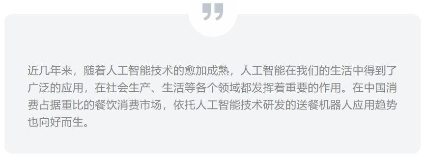 送餐機器人功能更智能化、更自動化、更流暢化的同時,也提升了機器人的服務效果,賦予了送餐機器人更高的商業價值,為送餐機器人進入社會各大餐飲消費場所,降低餐飲消費市場人力成本提供更多的可能。
